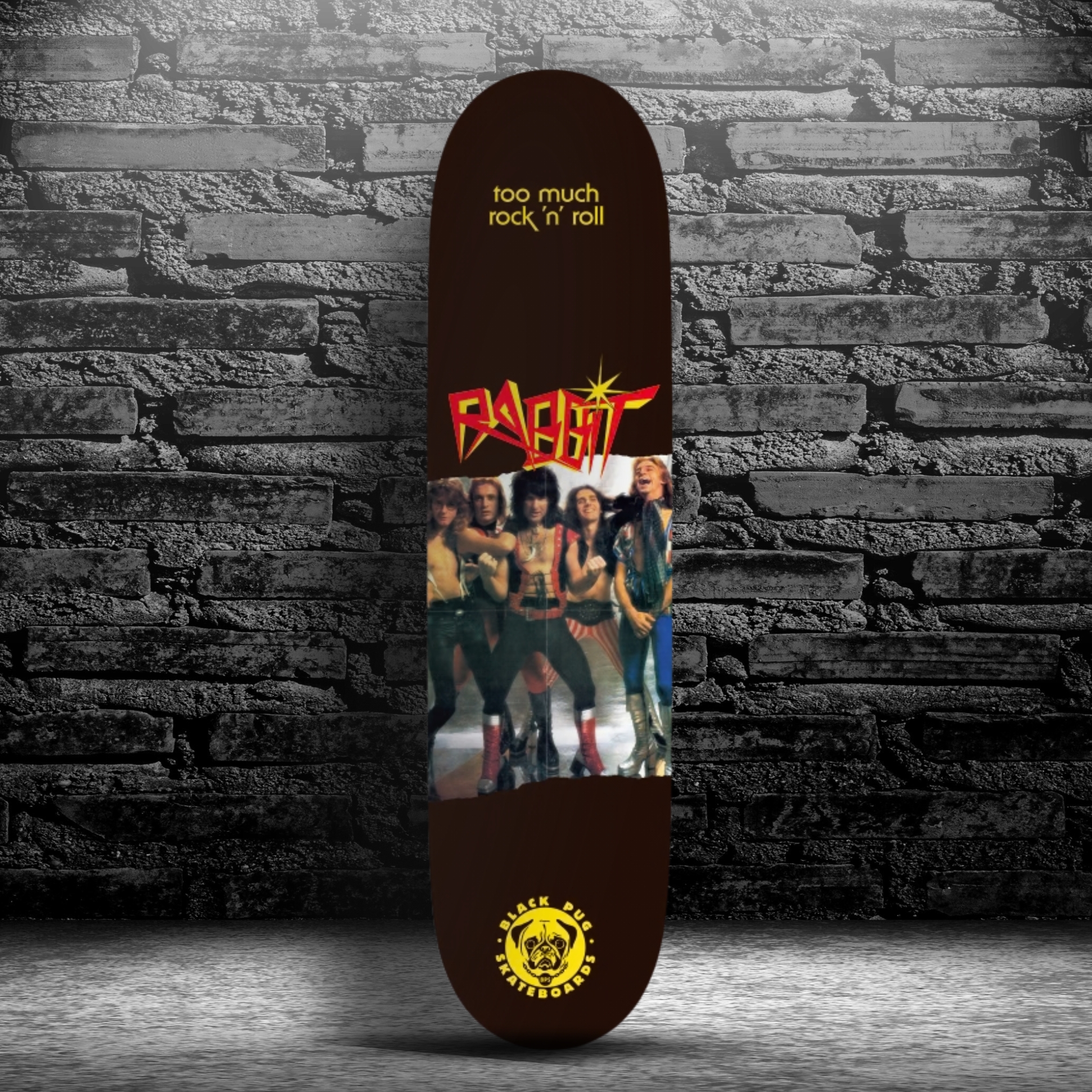 Black Pug Skateboards has unveiled a custom tribute deck celebrating the legendary Australian glam-rock band Rabbit and their 1976 Album “Too Much Rock and Roll“. Created as a gesture of admiration rather than a commercial release, the board stands as a visual salute to one of Australia’s most electrifying rock acts.